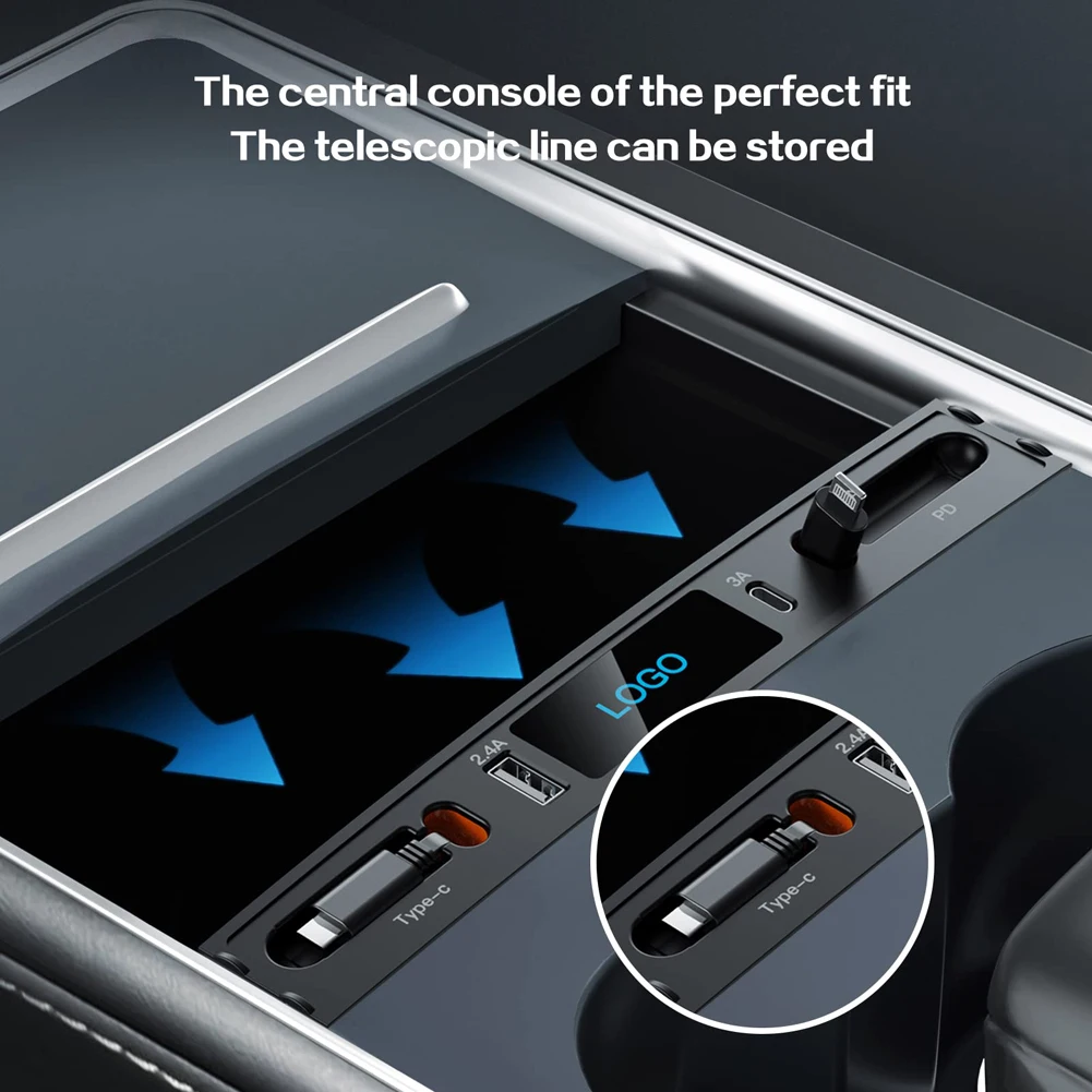 Docking Station 4 Ports Powered Splitter Extension Plug and Play USB Extender Hub 80cm Expandable Data Cable for Tesla Model 3/Y Feature: 1. Multiple Charging Ports: With four ports and an 80cm retractable data cable, expansion dock allows you to charge multiple devices simultaneously in your car, making it perfect for both front and rear seating areas. 2. Perfect Integration: Dock station is designed by using original car data, which ensures a perfect integration with the central armrest box for Tesla vehicle while not affecting the use of the storage box. It's a great solution to the limitations of the original design. 3. Plug-and-Play: With USB splitter, no additional drivers or complicated installation steps are needed. The LED ambient light, automatic lighting when the vehicle starts, and stylish design make it both convenient and cool. 4. Multi-Compatibility: HUB docking station can connect to multiple devices, including gaming controllers, and supports quick charging for both Android and Apple devices, making it highly compatible with different electronic devices. 5. Intelligent Protection: The polymer battery core and intelligent protection system on USB hub adapter ensure that the charging process is safe and convenient.