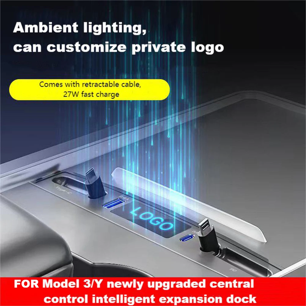 Tesla Model 3 Y Docking Station 27W Quick Charger USB LED Shunt Hub Extension Center Console 4 Ports Smart Sensor